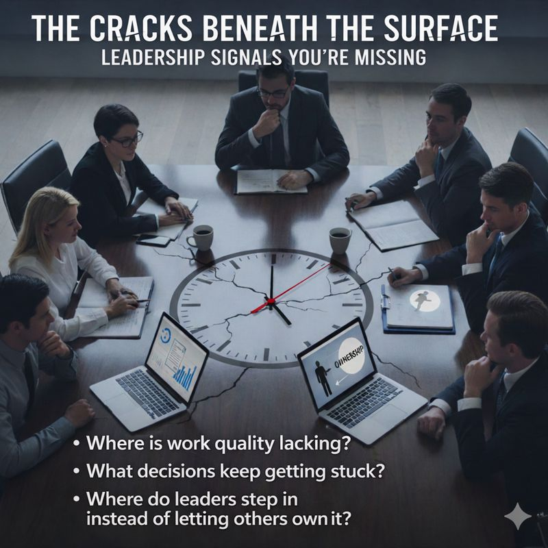 Many leaders feel things are mostly on track. Goals are set. Meetings happen. People stay busy. On the surface, it all looks fine . But underneath, small cracks often tell a different story. You may notice work getting redone, decisions slowing down, or people quietly avoiding ownership. These aren’t just workflow problems. They’re leadership signals — and they’re easy to miss when everyone is moving fast. Leaders often believe they’ve been clear. They think people know what’s expected and who owns what. And they assume that if something was wrong, someone would speak up. But in real life, expectations get interpreted in different ways. Ownership can feel risky. And many people stay silent just to keep the peace. That gap between what leaders intend and what teams experience is where performance starts to slip. A few simple questions can help reveal what’s really going on: · Where is work quality lacking? · What decisions keep getting stuck? · Where do leaders step in instead of letting others own it? Start noticing those patterns. They point to exactly where stronger leadership can make the biggest difference. 👉 See what a 10–15% leadership shift could mean for your bottom line. View the Leadership ROI Chart .